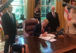 رئیسجمهور آمریکا روز دوشنبه در حالی که در اتاق بیضی کاخ سفید فرمان اجرایی اعمال تحریمهای جدید علیه ایران را امضا میکرد، اظهار داشت: ما به افزایش فشار علیه ایران ادامه خواهیم داد. ایران هرگز نخواهد توانست به سلاح هستهای دست پیدا کند.