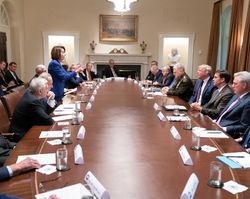 اوایل سال جاری نیز ترامپ و پلوسی در نشستی در کاخ سفید درگیری لفظی پیدا کردند که منجر به ترک جلسه توسط دمکراتها شد. پلوسی در آن زمان ترامپ را متهم به «سرپوش گذاشتن بر حقایق» در موضوع پرونده روسیه کرده بود.