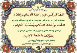 در دعای روز هشتم ماه مبارک رمضان آمده است: «خدایا در ماه رمضان مهرورزی نسبت به یتیمان را روزیام گردان چرا که رحم کردن به یتیم با خلوص نیت قلب را جلا میدهد. خدایا روزی کن که من اطعام طعام کنم و افطاری دهم، اطعام طعام مخصوصاً به فقرا و مستحقان از کارهای بسیار نیکو است.»                              بسم الله الرحمن الرحیم