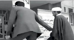 امام جمعه از بخشدار می خواهد پشت تریبون نرود. بخشدار دست امام جمعه را کنار می زند.