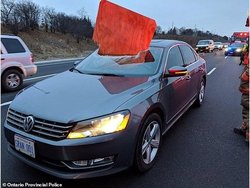 این زنان در بزرگراهی در کانادا با خودروشان در حال حرکت بوده اند که یک ورقه تخته سه لا در پی تندباد از یک تریلر جدا و با شیشه جلوی خودرو برخورد کرده و در آن فرو رفته است.