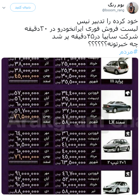 چون مردم با شرایط فعلی مجبور شده‌اند در بازار آزاد پراید را به قیمت ۴۵ میلیون تومان و پژو ۲۰۶ را به نرخ ۸۳ تا ۹۳ میلیون تومان بخرند.