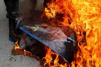 فلسطینی‌هایی که در محکومیت کشتار مسجد ابراهیمی دست به تظاهرات گسترده در الخلیل زده بودند، تصاویر رئیس‌جمهور آمریکا را به آتش‌ کشیدند.