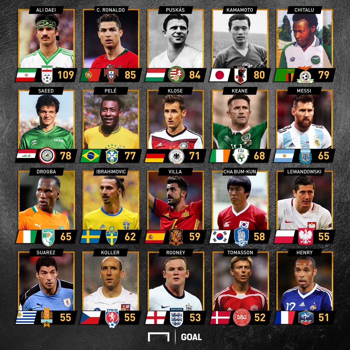 بر این اساس علی دایی با 109 گل در صدر قرار دارد. کریس رونالدو با 85 گل در رده دوم قرار دارد. فرانس پوشکاش با 84 گل عنوان سوم را در اختیار دارد.