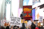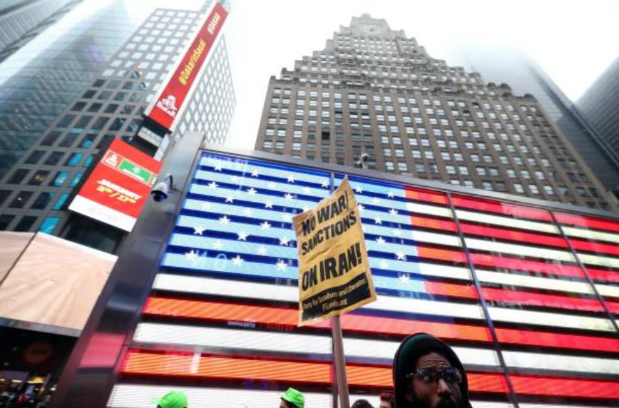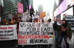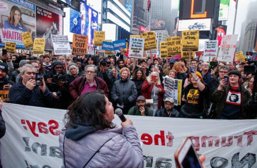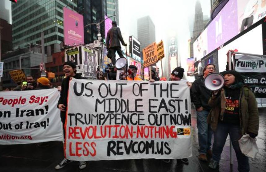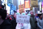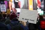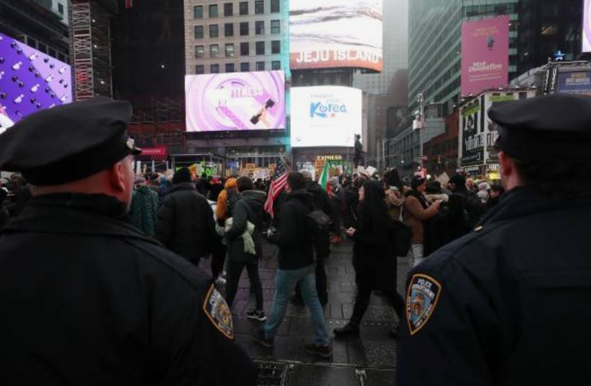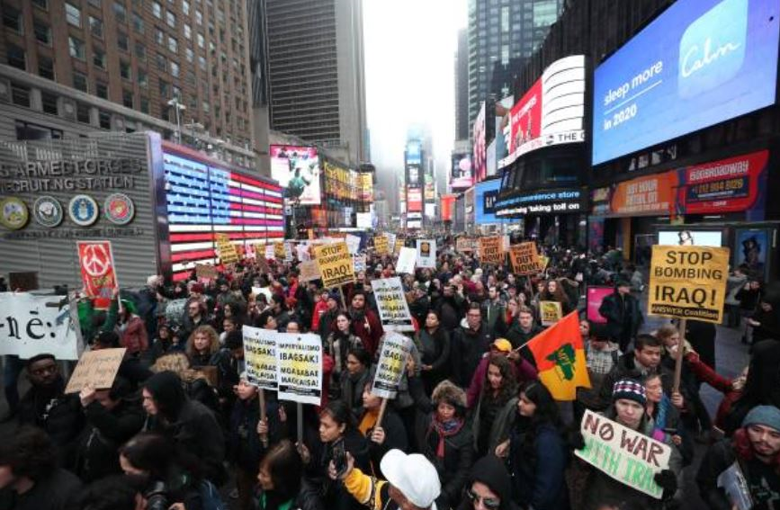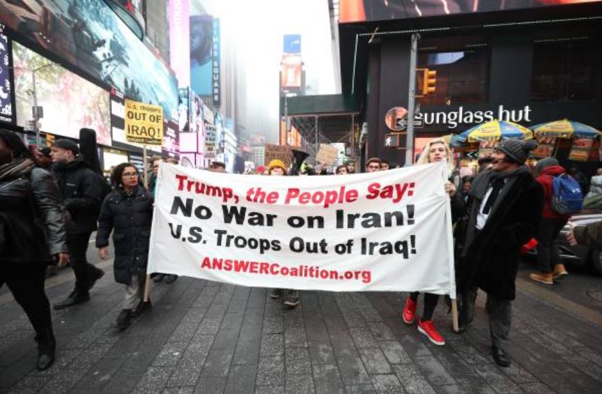 در نیویورک، معترضان با در دست داشتن پلاکاردهایی با مضامین ضدجنگ، خروج نظامیان آمریکایی از غرب آسیا و پایان دادن به جنگهای این کشور در این منطقه را خواستار شدند.
