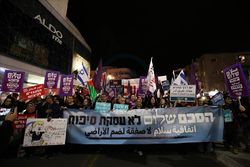 معترضان با در دست داشتن پلاکاردهایی که بر روی آن ها به زبان عبری و عربی نوشته شده بود: «راه دیگری هم است»، «ما طرح آمریکا را نمی پذیریم» و «آری به صلح و نه به الحاق کرانه باختری» علیه طرح صلح ترامپ تظاهرات کردند.