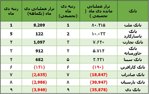 به طوری که توانسته است با ثبت مبلغ 8،209 میلیارد ریال تراز مثبت عملیاتی در دی ماه و 80،215 میلیارد ریال در ده ماهه وکسب رتبه نخست، با اختلاف چند برابری، سرآمد تمام بانک های بورسی باشد.