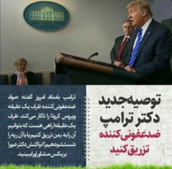 به گزارش آوای نشاط، دونالد ترامپ، رئیس‌جمهور آمریکا در ادامه نسخه‌پیچی‌های عجیب خود برای درمان کرونا اعلام کرد تزریق مواد ضدعفونی‌کننده به بدن و قرارگرفتن در معرض اشعه ماورا بنفش به درمان کرونا کمک می‌کند.