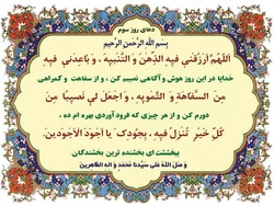 «اللَّهُمَّ ارْزُقْنِی فِیهِ الذِّهْنَ وَ التَّنْبِیهَ، وَ بَاعِدْنِی فِیهِ مِنَ السَّفَاهَةِ وَ التَّمْوِیهِ، وَ اجْعَلْ لِی نَصِیبا مِنْ کُلِّ خَیْرٍ تُنْزِلُ فِیهِ، بِجُودِکَ یَا أَجْوَدَ الْأَجْوَدِینَ».