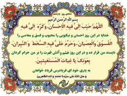 «خدایا دوست گردان نزد من در این ماه احسان و نیکی را و ناخوشدار در پیش من در این روز فسق و نافرمانی و گناه را و حرام گردان در این روز بر من خشم کیفربار و آتش (سوزان) را به کمک خودت، ای فریاد رس فریادخواهان. »