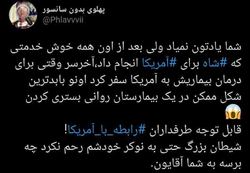 "آوای نشاط"، کاربر فضای مجازی در توییتر نوشت: شما یادتون نمیاد ولی بعد از اون همه خوش خدمتی که شاه برای آمریکا انجام داد، آخرسر وقتی برای درمان بیماریش به آمریکا سفر کرد اونو با بدترین شکل ممکن در یک بیمارستان روانی بستری کردن
